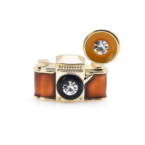 Give style and trend to your clothes by wearing our brown camera brooch!